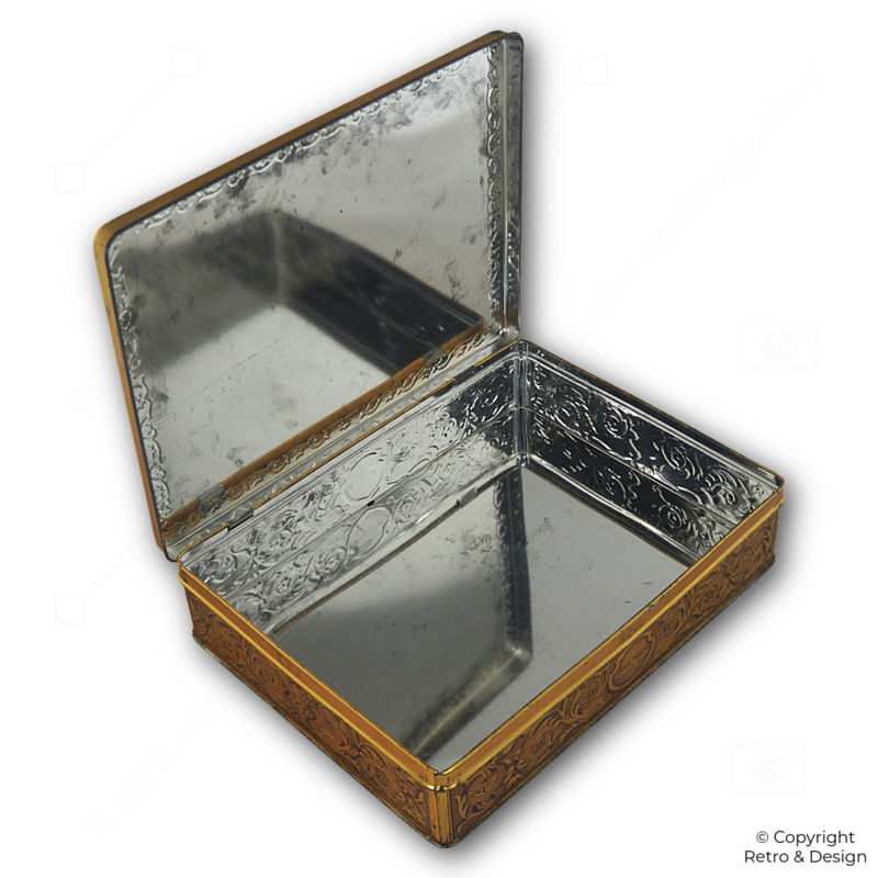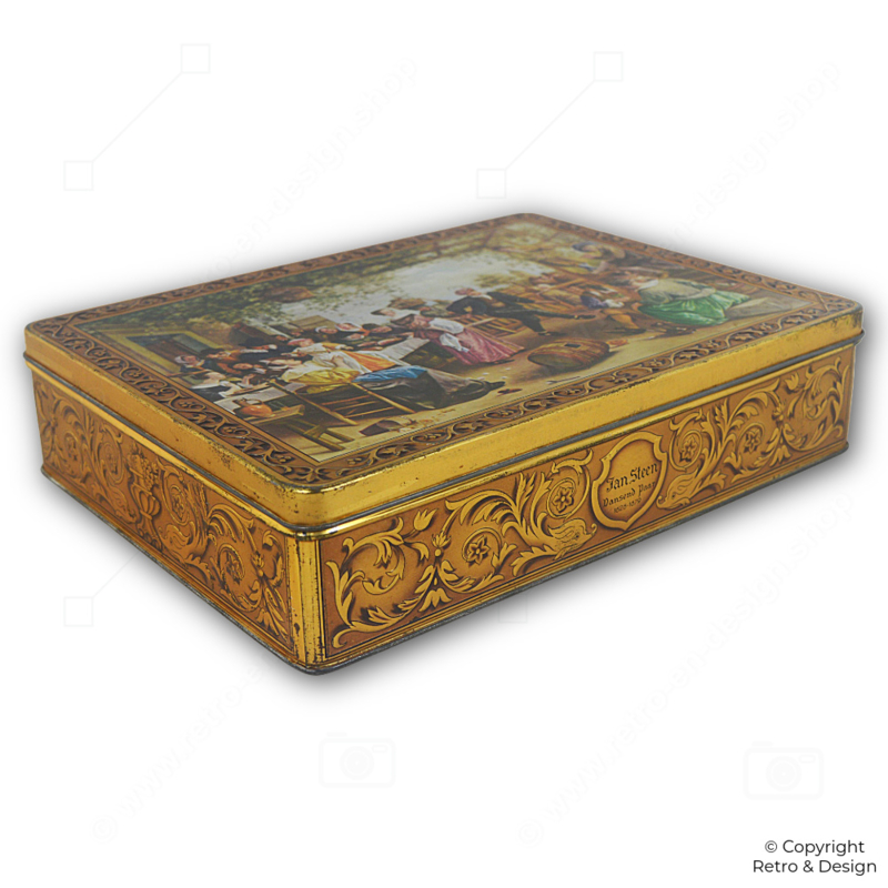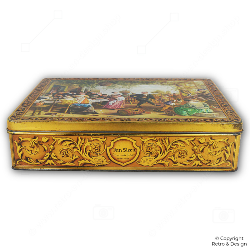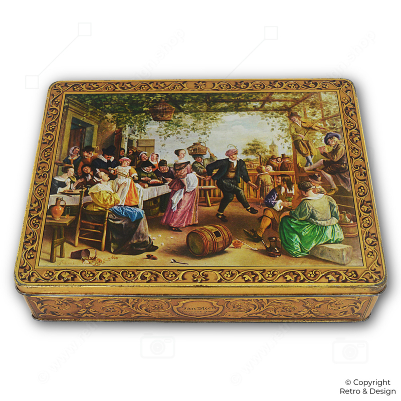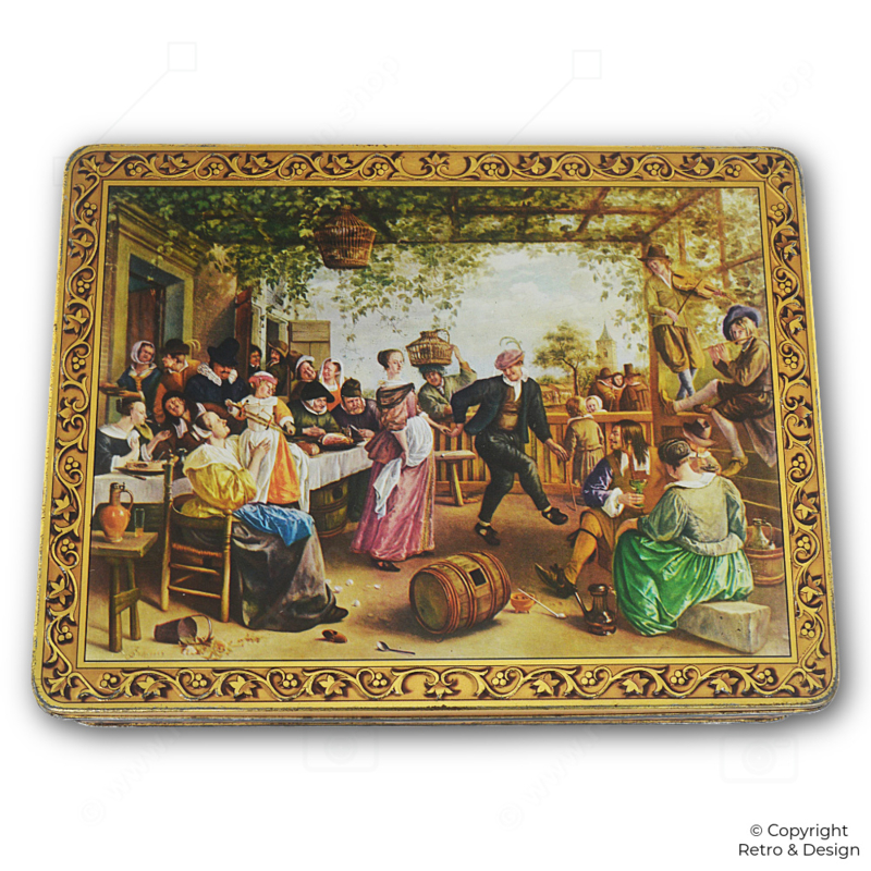 • Rectangular vintage tin with a hinged lid, decorated with a reproduction of Jan Steen’s painting The Dancing Couple.