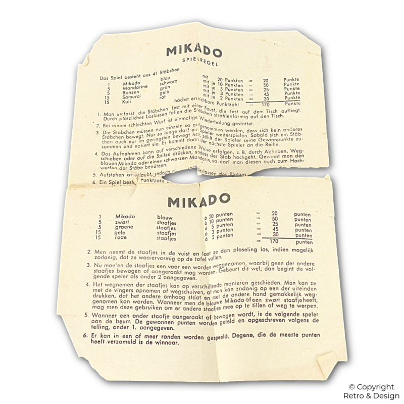 Mikado is believed to have Asian origins, and its name refers to the Japanese emperor. The game became popular in Europe during the 20th century. This edition, with multilingual rules, was likely produced for an international market in the latter half of the 20th century.