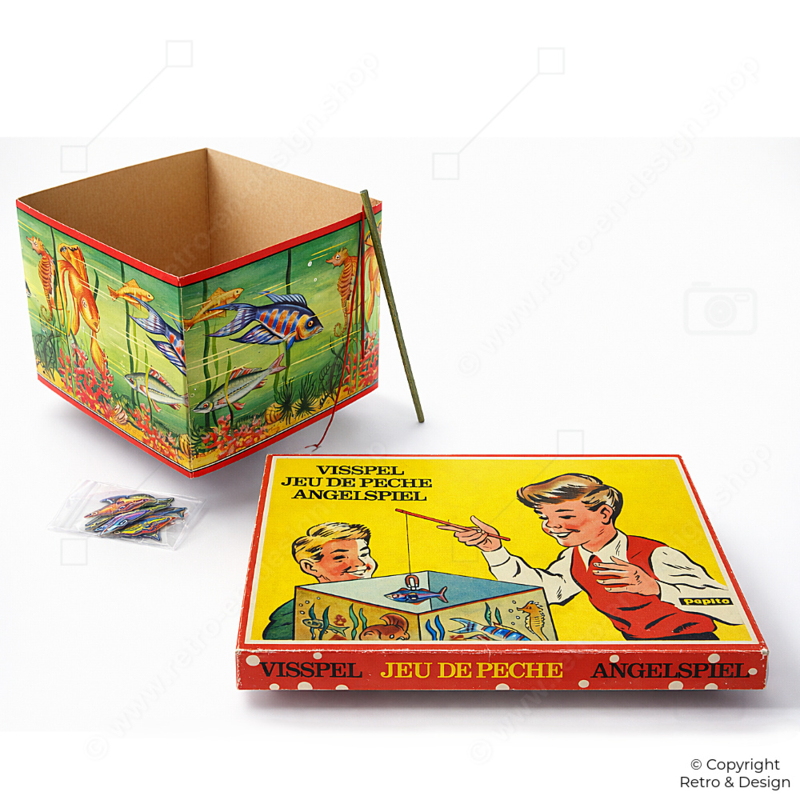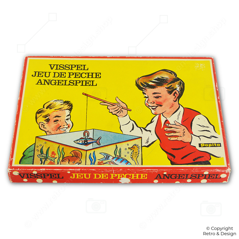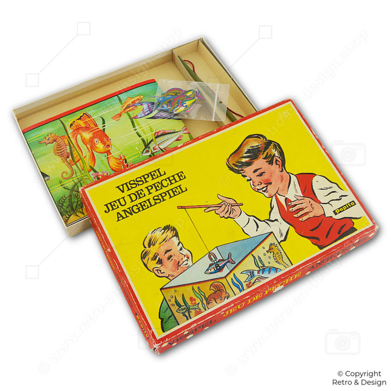 • This original vintage fishing game by Papita is a classic dexterity game for young and old alike. Also known as Jeu de Pêche or Angelspiel, players use a magnetic fishing rod to catch fish from a cardboard “aquarium.”