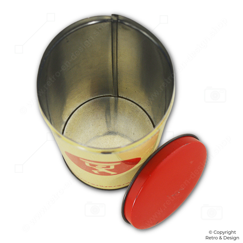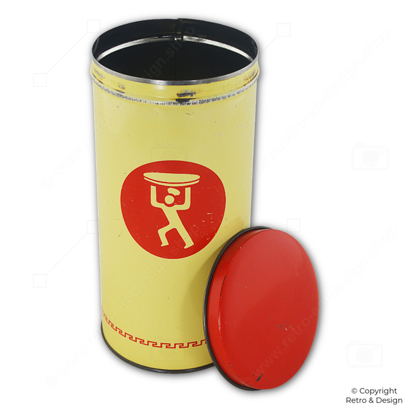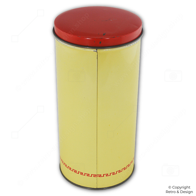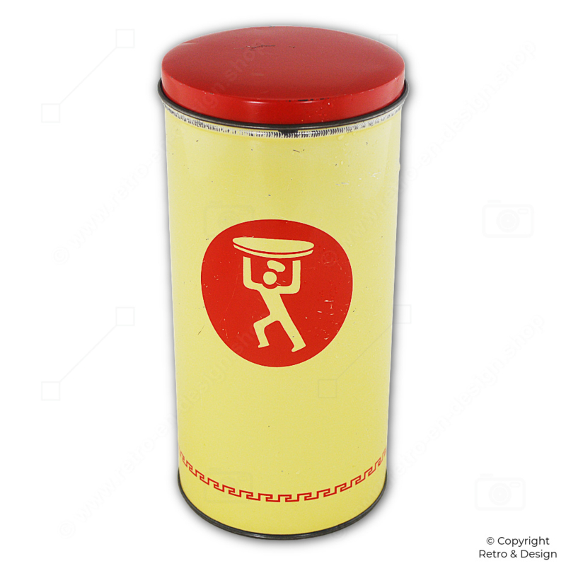 This cylindrical biscuit tin keeps your biscuits fresh and crisp by protecting them from moisture. The lid features an orange-red roll edge for practicality. The decorative image of the Turkstra baker makes the tin a charming collectible for enthusiasts of vintage kitchenware and advertising memorabilia.