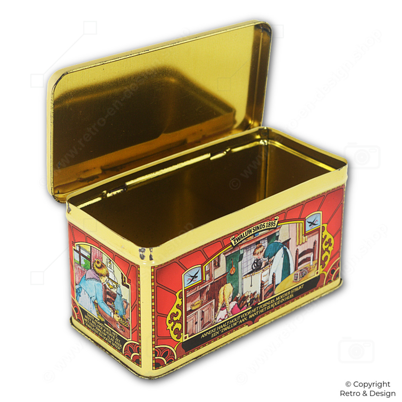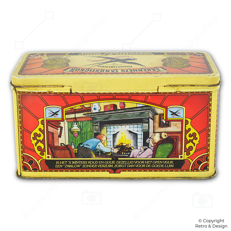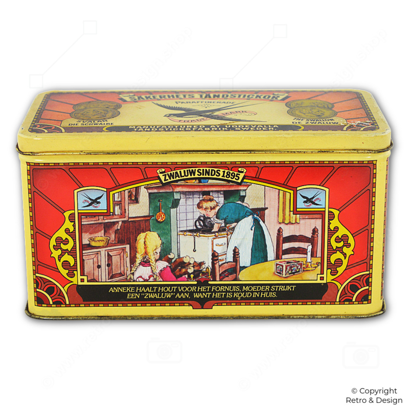 • Decorative rectangular match tin by Zwaluw, featuring nostalgic domestic scenes and four short rhymes. This Swedish design refers to “Säkerhets Tändstickor” (safety matches) and proudly displays the brand line “since 1895.”