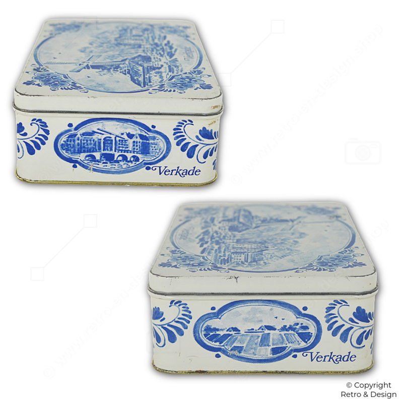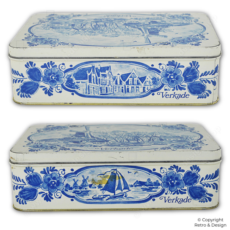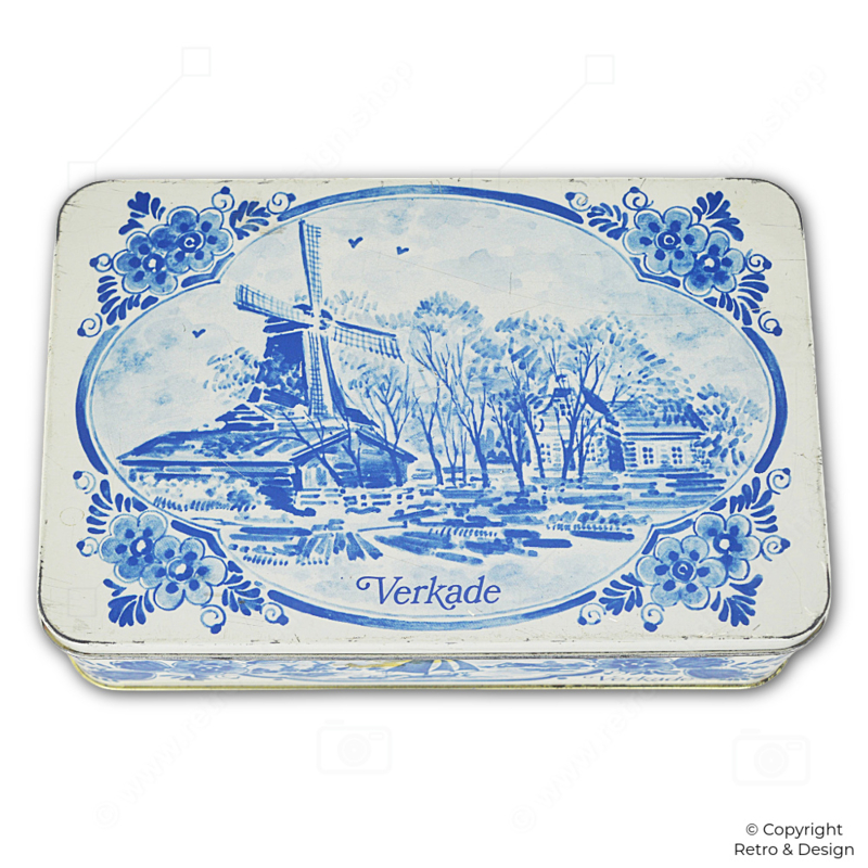 • This charming vintage biscuit tin by Verkade features a classic Dutch scene with windmills, sailing boats, and elegant Delft blue floral motifs.