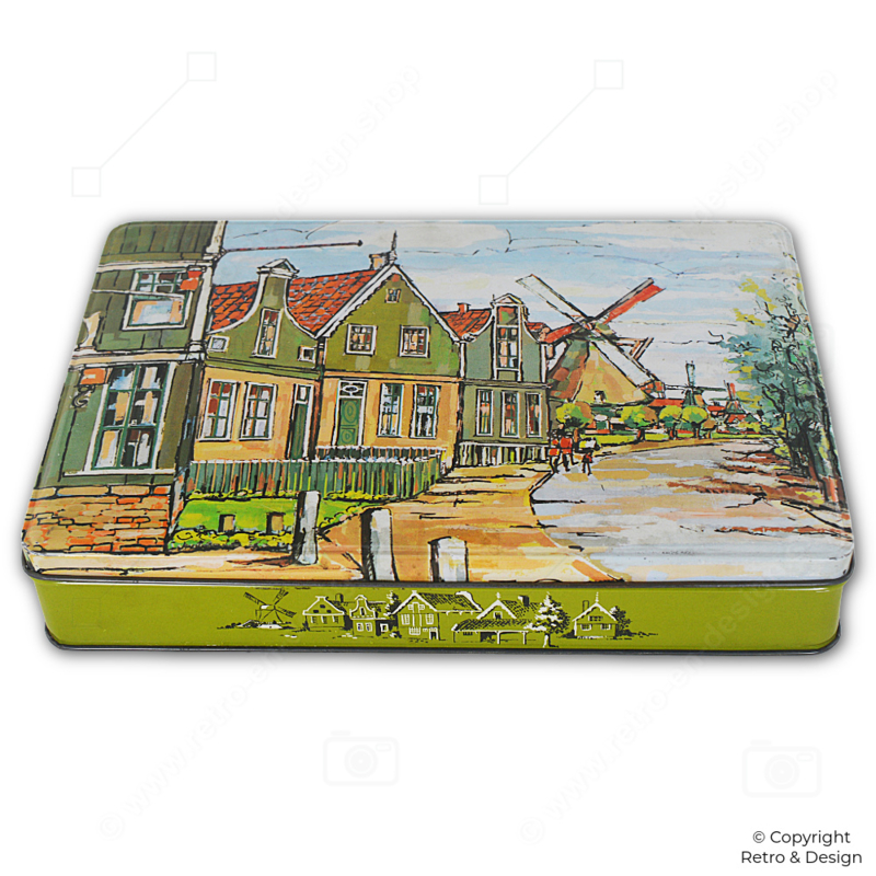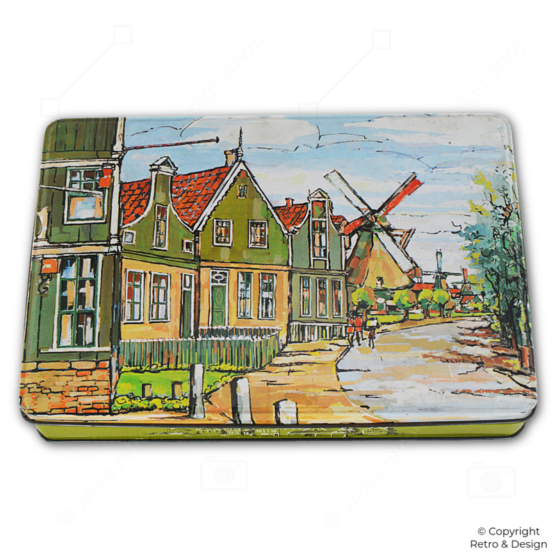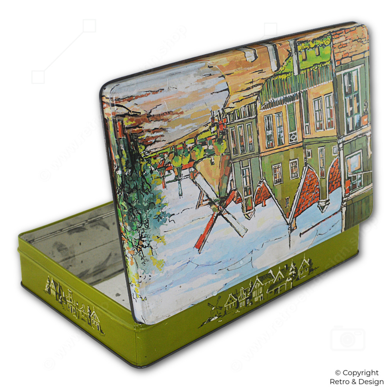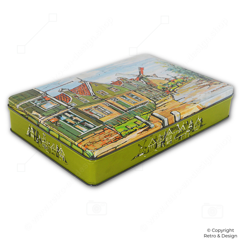 This authentic vintage tin is decorated all around with a black-and-white panoramic view of the Zaanse Schans. The lid features a watercolor-style illustration of traditional Zaan houses and a windmill, giving the piece a warm, nostalgic feel. The moss green base adds a calm, stylish look. The tin is in attractive vintage condition; light wear and patina are consistent with age and enhance its authentic character. Photos are part of the description.