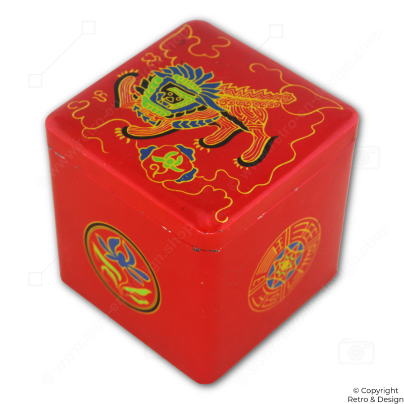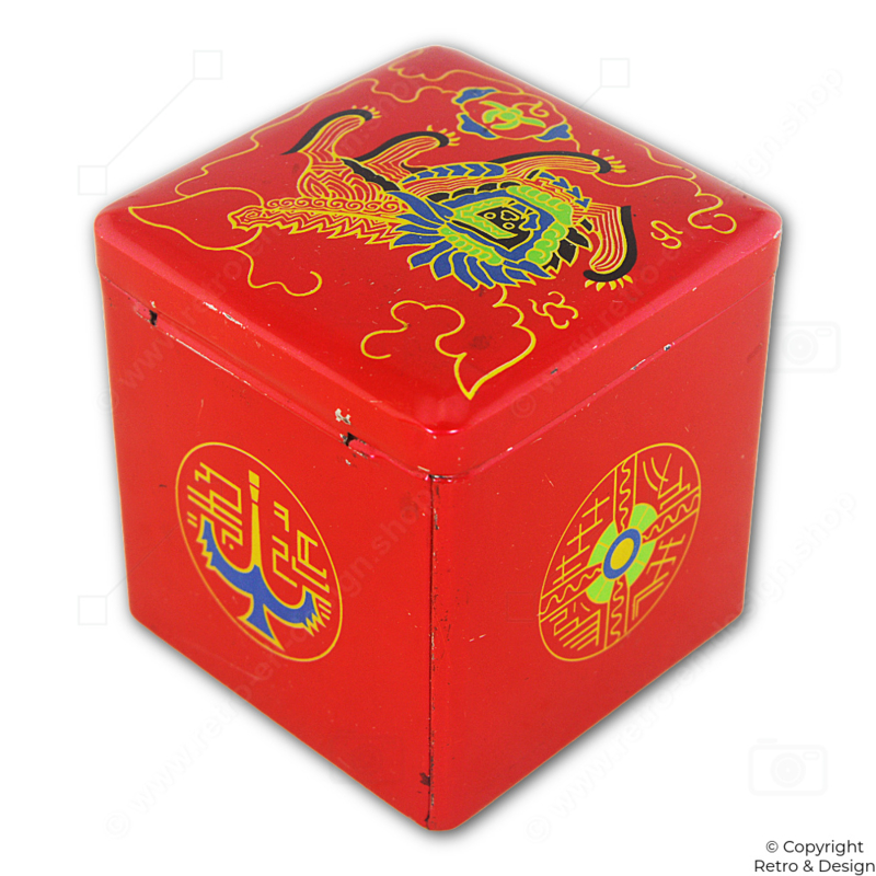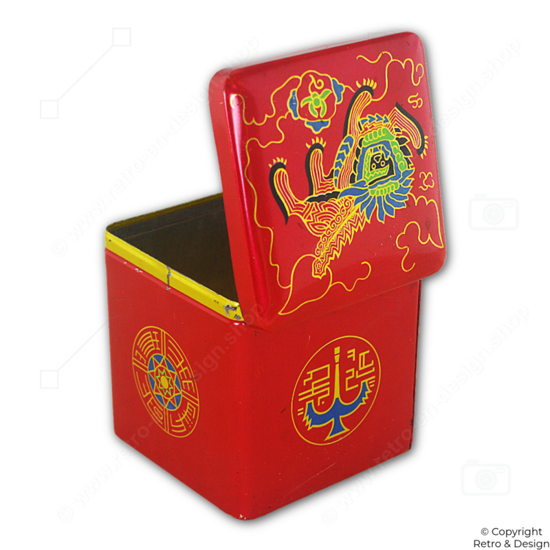 • Authentic Van Nelle tea tin in a cube shape, featuring an atmospheric image of an Oriental lion or Chinese dragon.