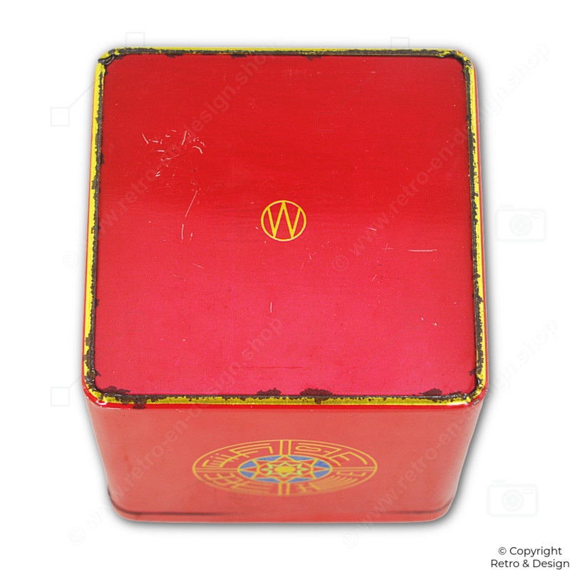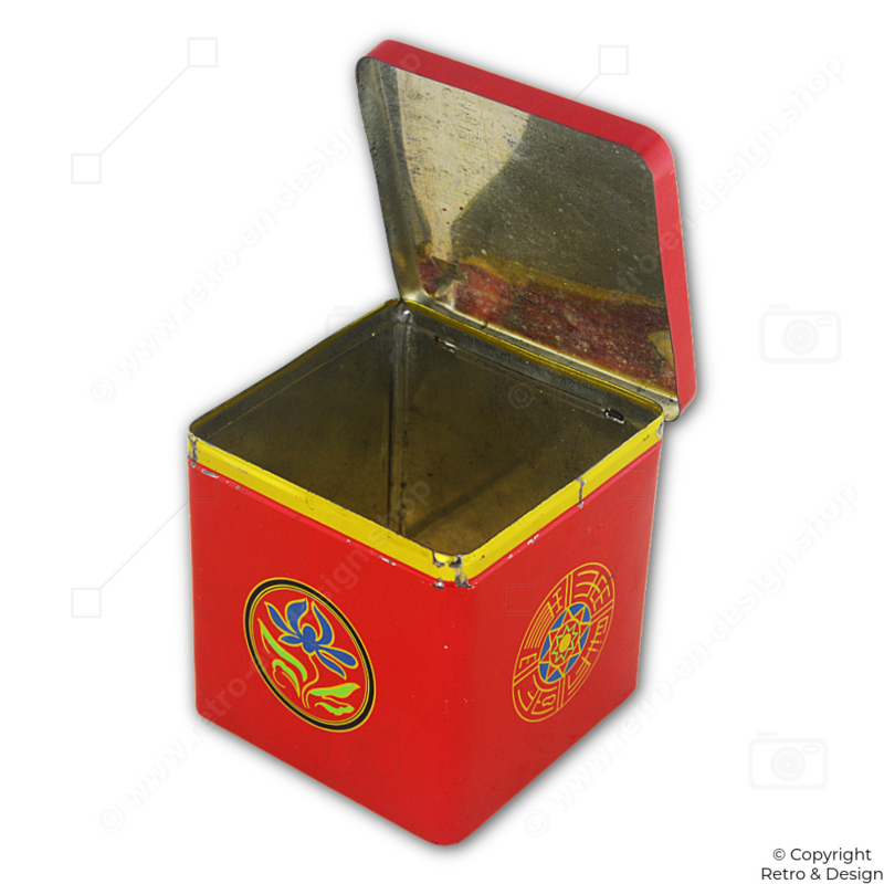 Produced by Nederlands Vereenigde Blikfabriek, renowned for high-quality tins made for Dutch brands such as Van Nelle. This cube combines practical storage with a striking mid-20th-century decorative design.