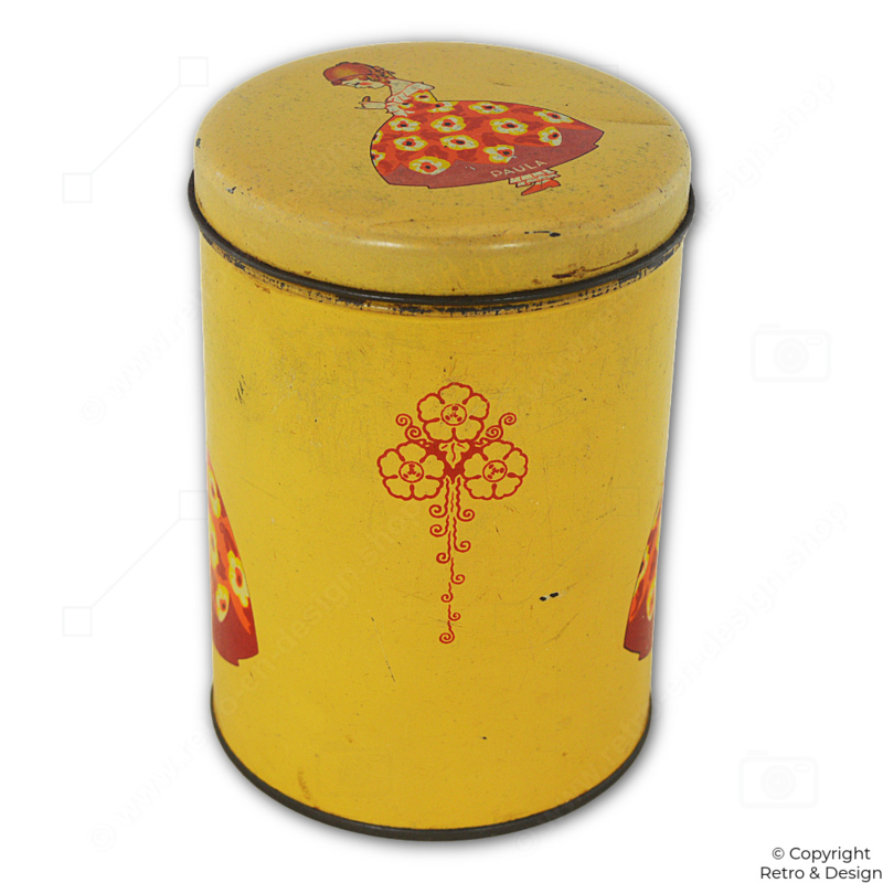Originally used for storing rusks or biscuits, this tin blends everyday functionality with charming graphic design. The creamy yellow base with colorful illustrations of Paula and hand-applied dot detailing gives the tin a warm, artisanal look. The sturdy lid and rolled edges make it durable and still perfectly usable today.