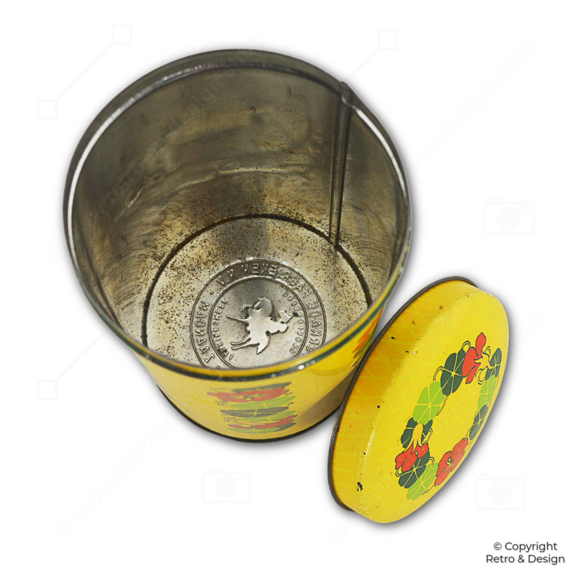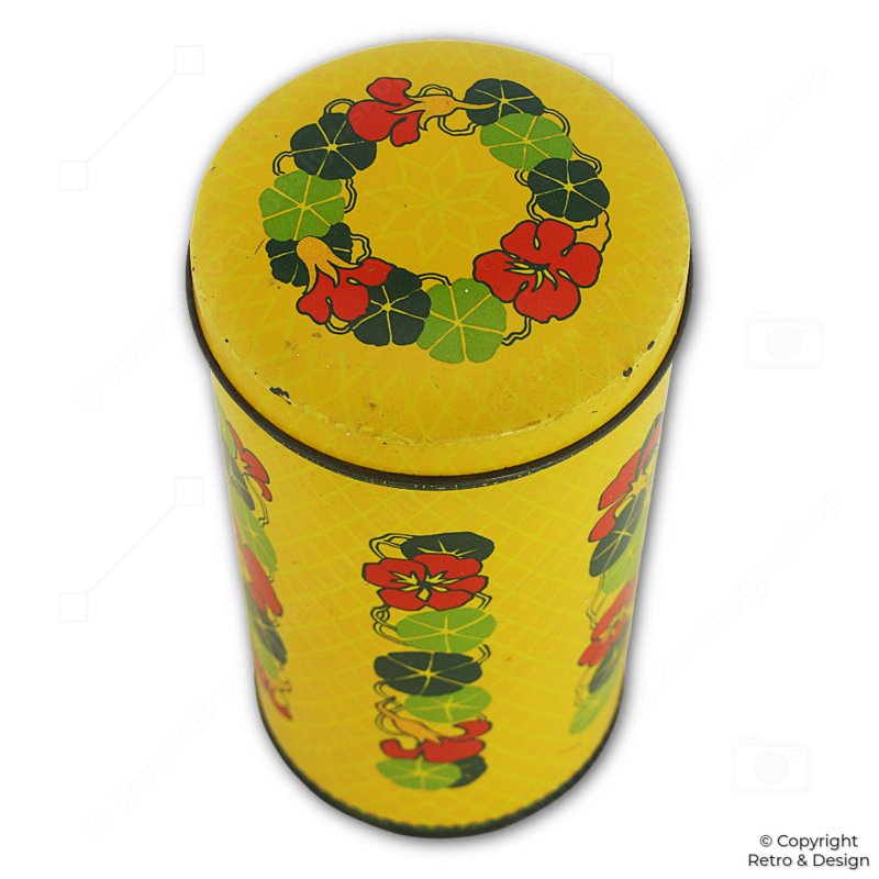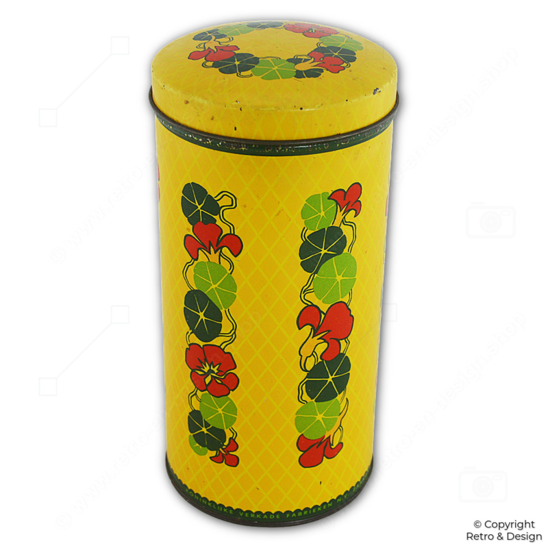 • Authentic yellow Verkade rusk tin featuring a decorative nasturtium motif, designed by Cees Dekker.