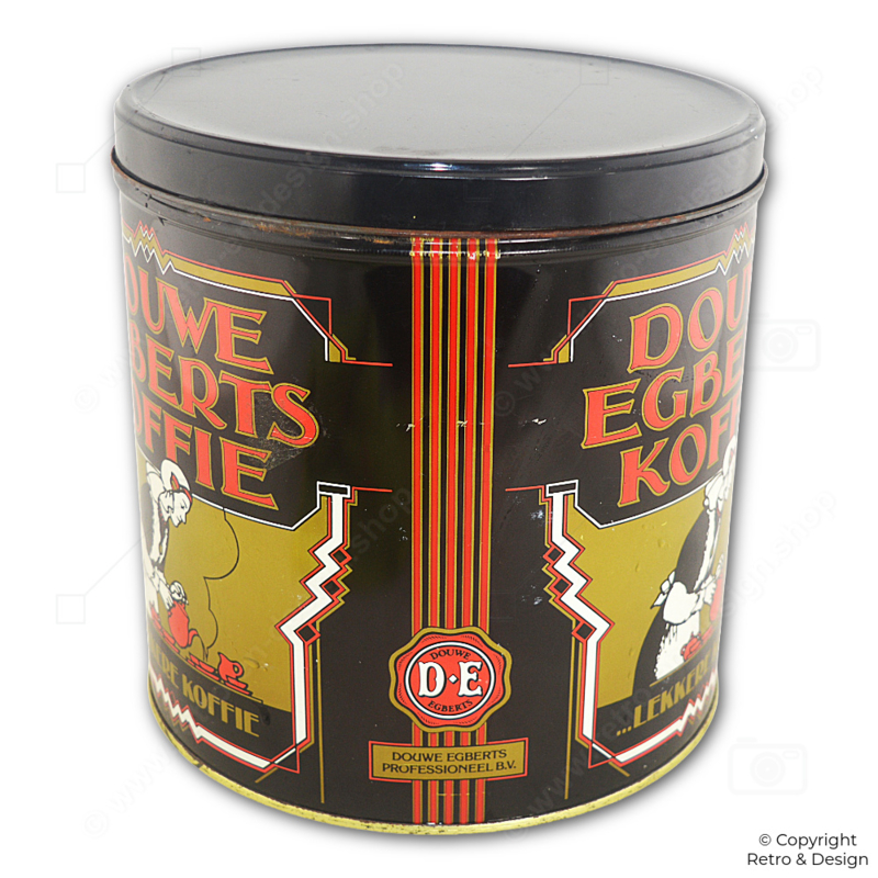 This large round coffee tin from the 1960s is a characteristic collectible from Dutch coffee culture. The tin features a black base color with striking red, white and gold accents.