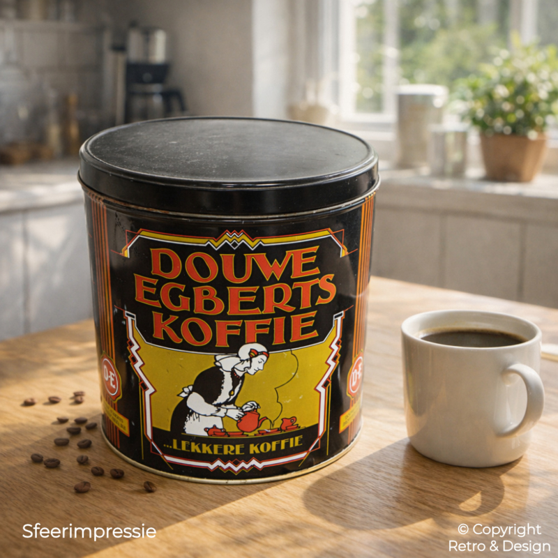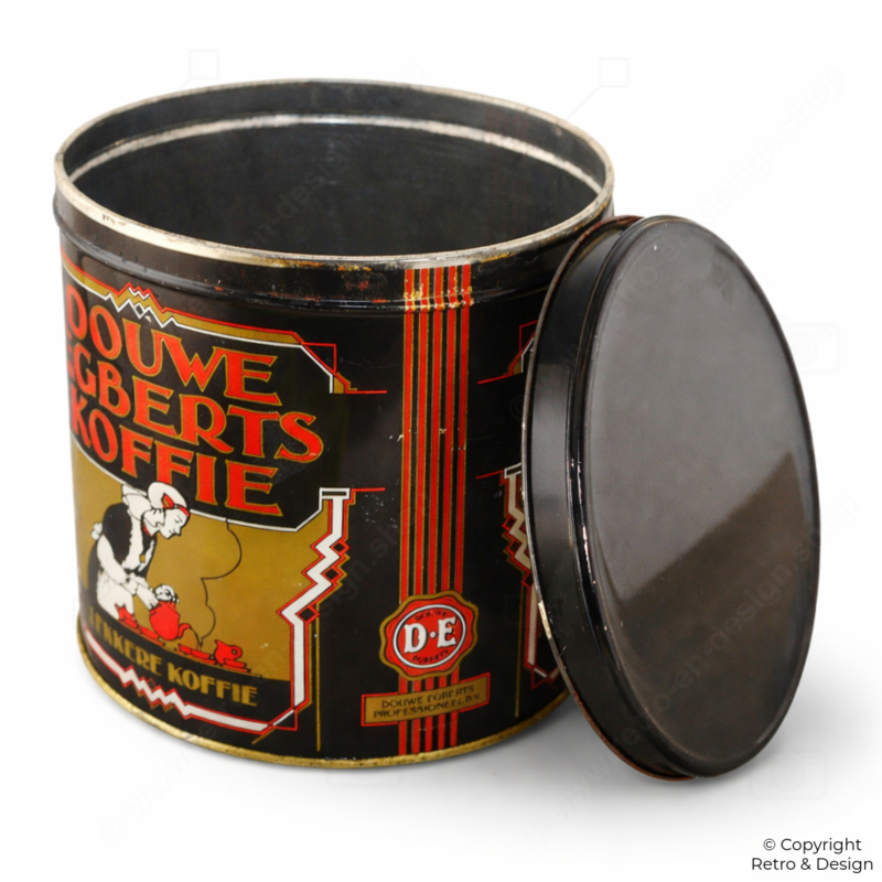 • Large round Douwe Egberts coffee tin from the 1960s featuring the characteristic image of a woman pouring coffee in traditional Frisian costume.