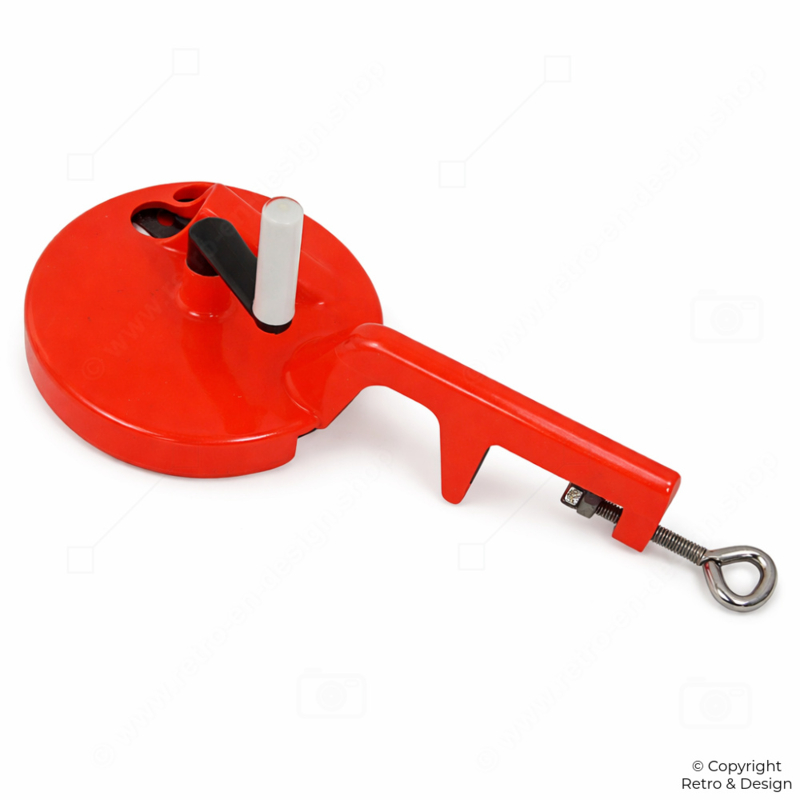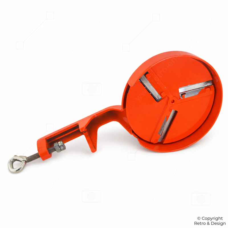 SKU: BC-5595-26Vintage PeDe Bean Slicer – Orange Steel with Table Clamp (1960s)