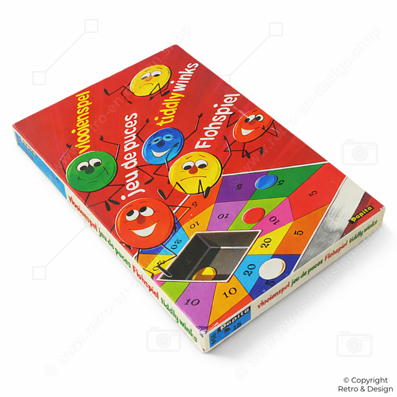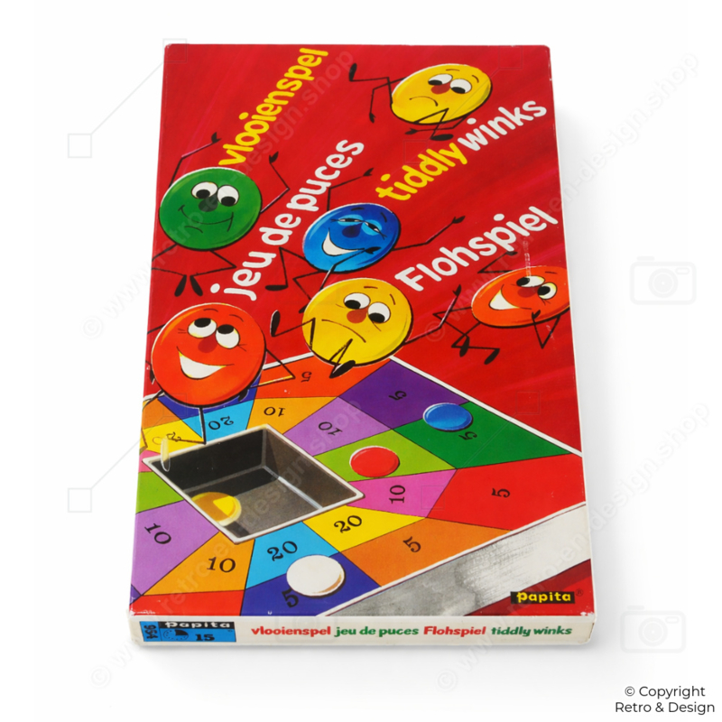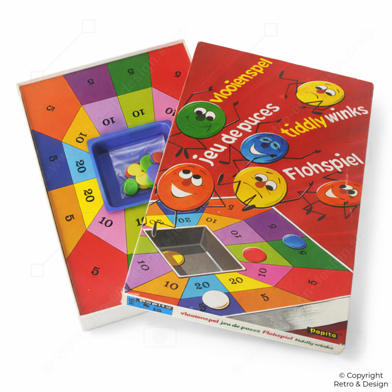 • Vintage Tiddlywinks game by Papita from 1975. A classic dexterity game where players use a larger disc to flick smaller pieces toward a target or scoring areas on the board.