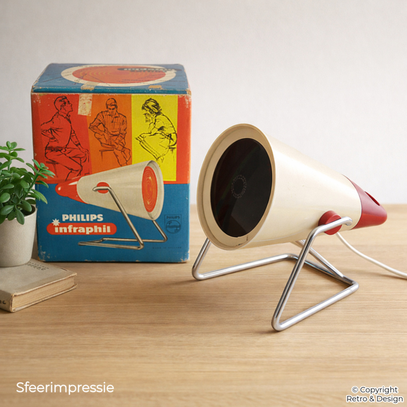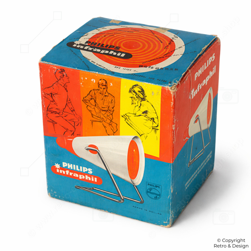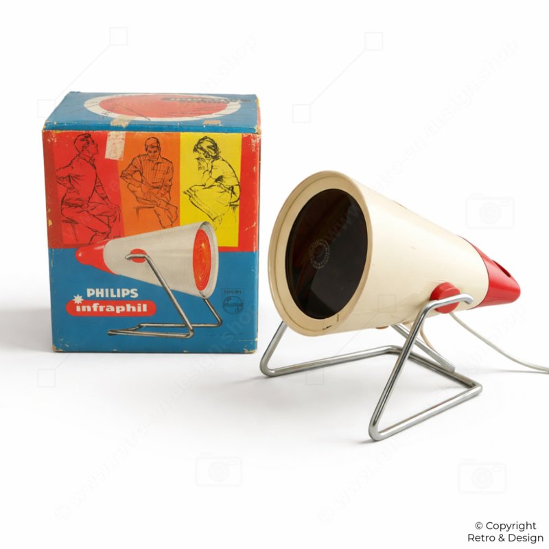 The brand name Infraphil was registered in 1945, combining “infrared” and “Philips.” From 1946 onwards, Philips introduced a range of infrared lamps worldwide, with the Infraphil line becoming a well-known and trusted household product.