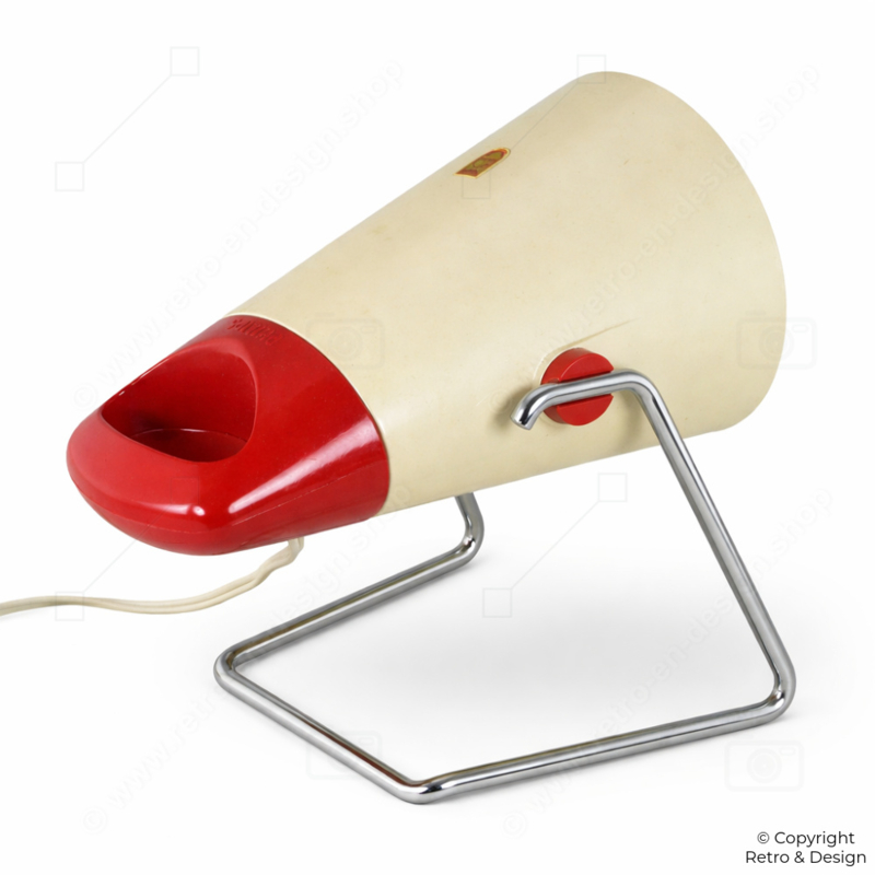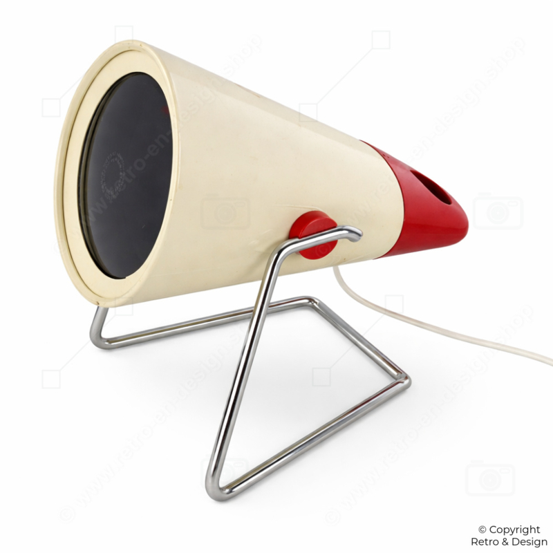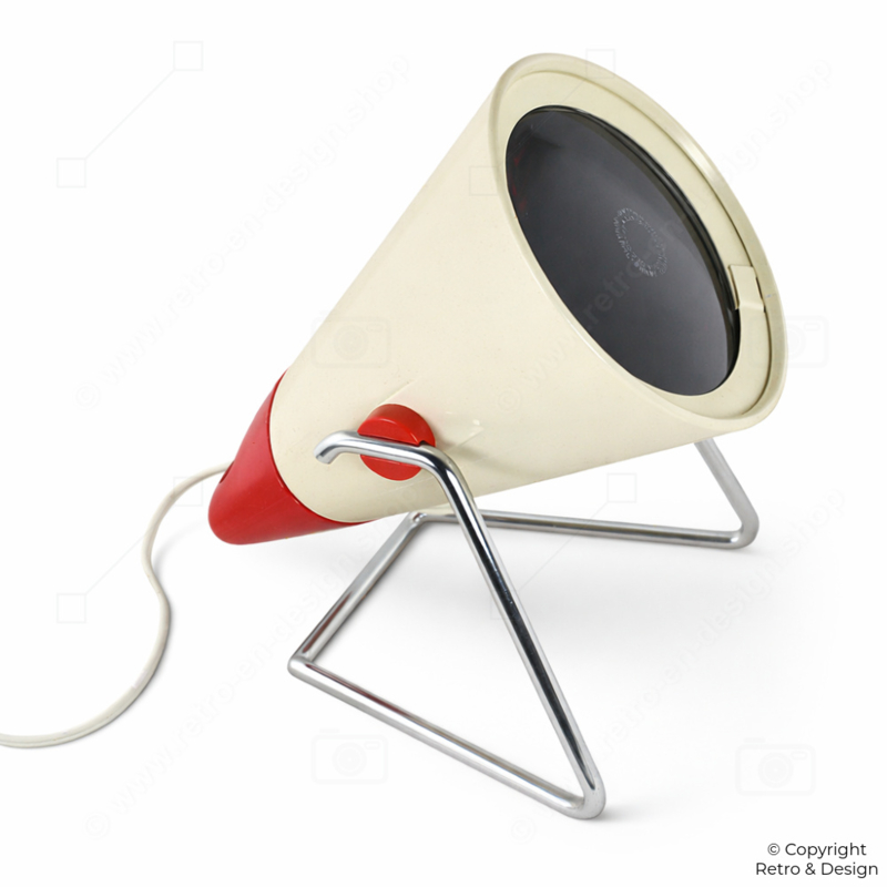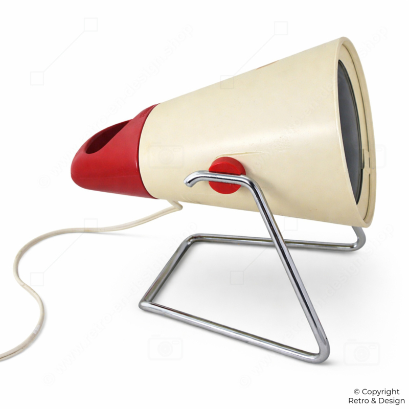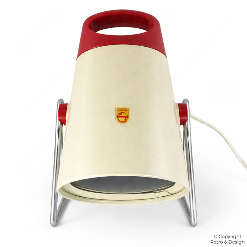 This Philips Infraphil KL7500 is a characteristic example of functional industrial design from the 1960s. The lamp features a pressed glass bulb with an integrated Fresnel lens—an innovative feature for its time.