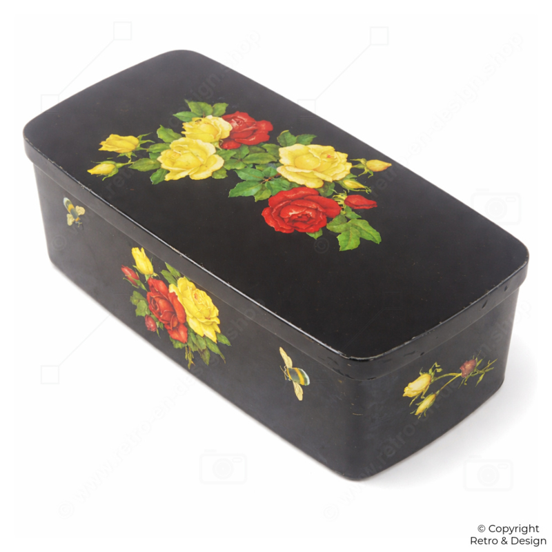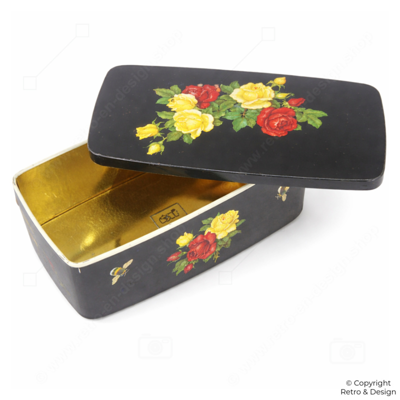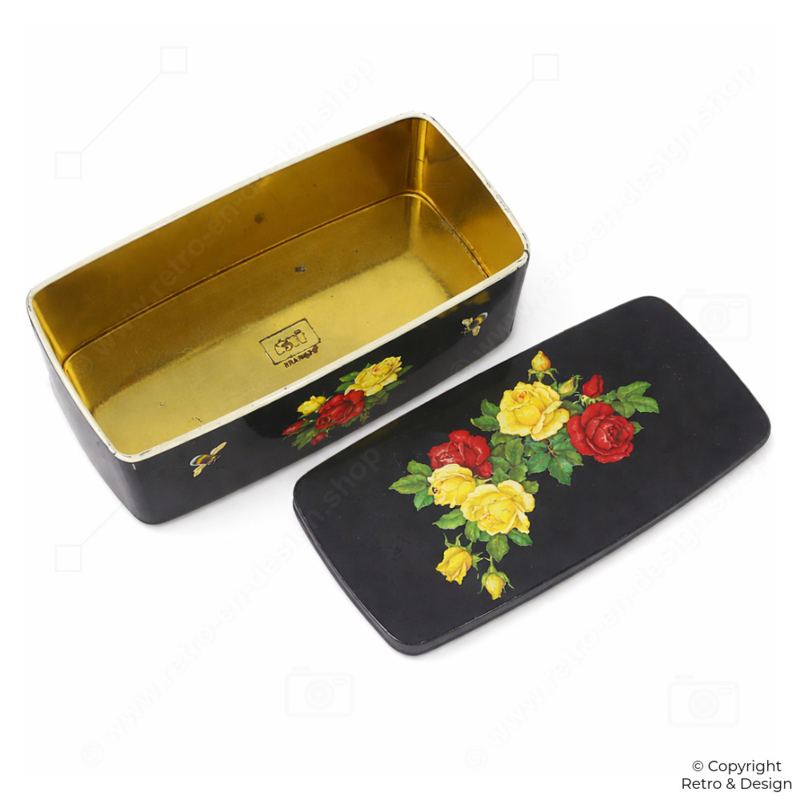 This vintage tin is a fine example of Danish design, featuring a warm and decorative appearance. The combination of the dark background and the rose decoration gives the tin a charming and nostalgic character. Originally, tins like this were used in the kitchen for storing items such as biscuits, tea, or spices.