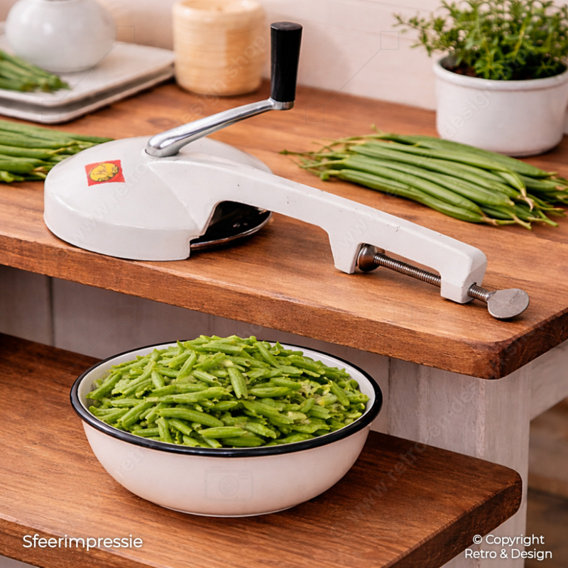 This PeDe green bean slicer is a classic kitchen tool from a time when functionality and durability were key. Beans are fed through the opening and sliced evenly by turning the handle.