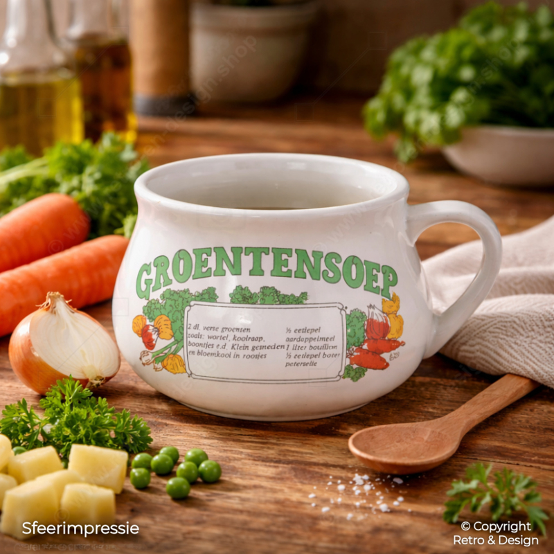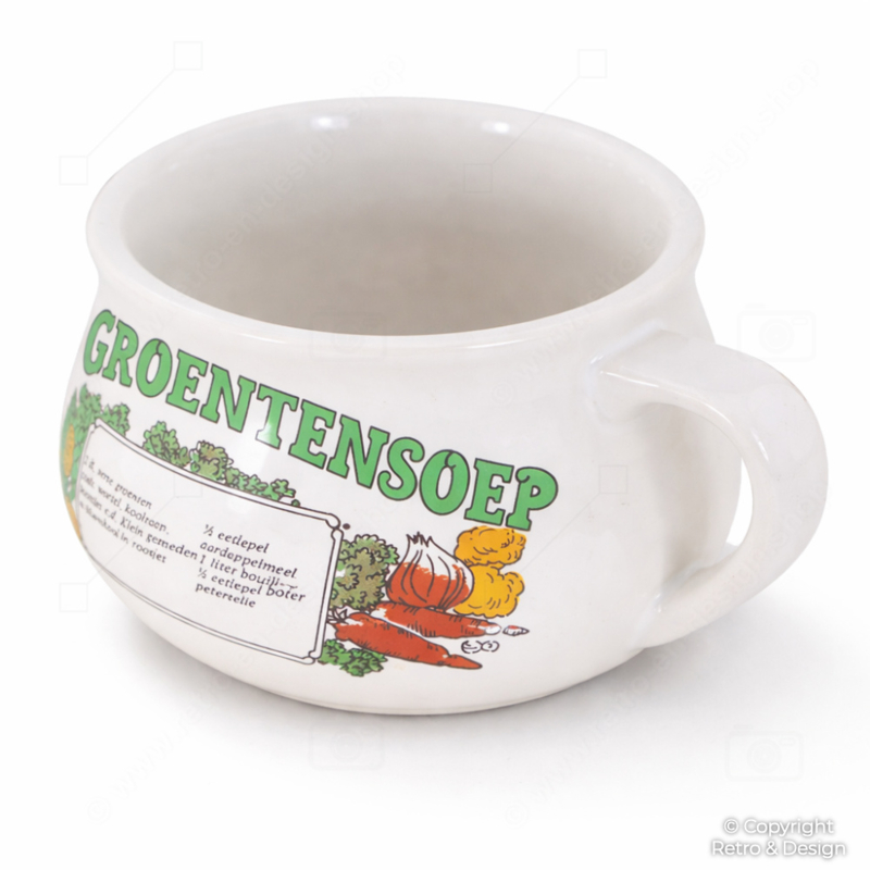 Soup mugs with printed recipes on the exterior were especially popular in the Netherlands during the 1970s and 1980s. They were produced by various manufacturers, often unmarked, and formed part of everyday Dutch kitchenware.